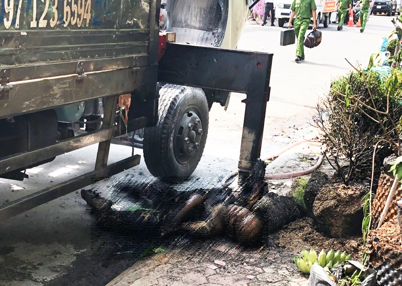 Các hình ảnh hiện trường cho thấy, nạn nhân, trong tình trạng cháy đen, nằm dưới lòng đường sát với chân chống trước phải của cần cẩu, đầu ghếch gần vuông gốc với vỉa hè.