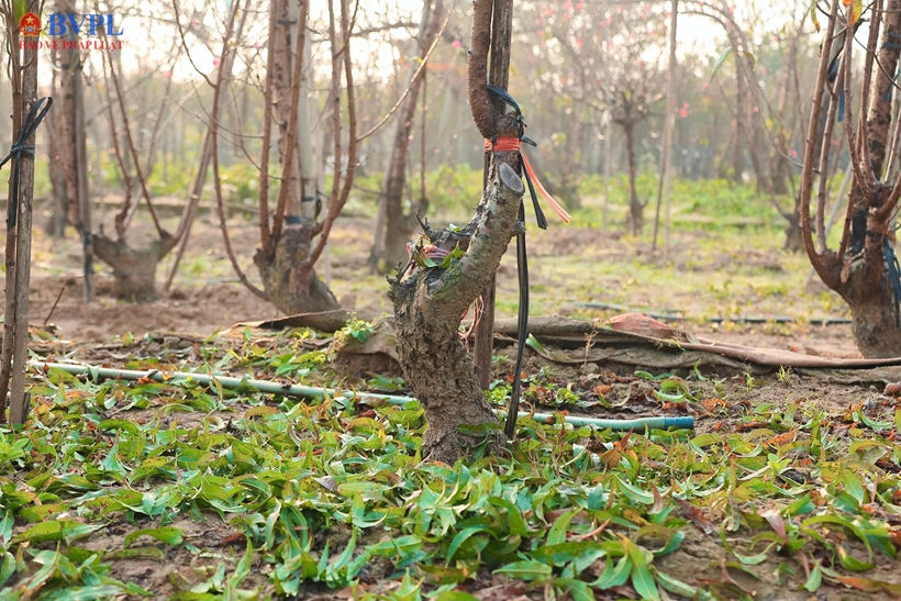 | Lá đào sau khi được tuốt sẽ được tận dụng ủ lại làm phân bón trực tiếp cho gốc cây, giúp bổ sung nguồn dinh dưỡng tự nhiên, cải tạo đất và hỗ trợ cây sinh trưởng khỏe mạnh. |