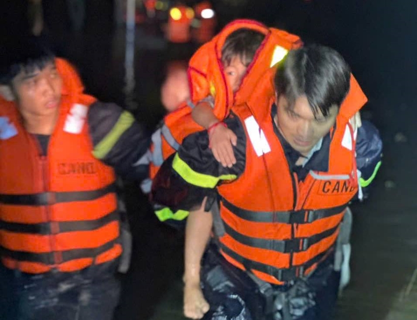 Tại khu phố Cầu Đôi, nước dâng cao tới 2 mét, chảy xiết bao quanh căn nhà của ông Trần Văn Lý. Lực lượng cứu hộ đã dùng áo phao, phao cứu sinh, dây cố định vào cấu kiện, vượt qua dòng nước dữ, giải cứu 7 người, trong đó có 2 trẻ em ra ngoài an toàn.