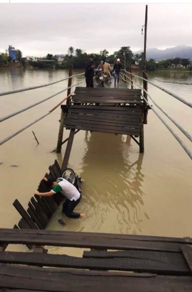 | Vào mùa mưa (khoảng tháng 10- tháng 11) hàng năm, cầu thường bị nước lũ cuốn trôi các nhịp giữa dòng chảy.. |