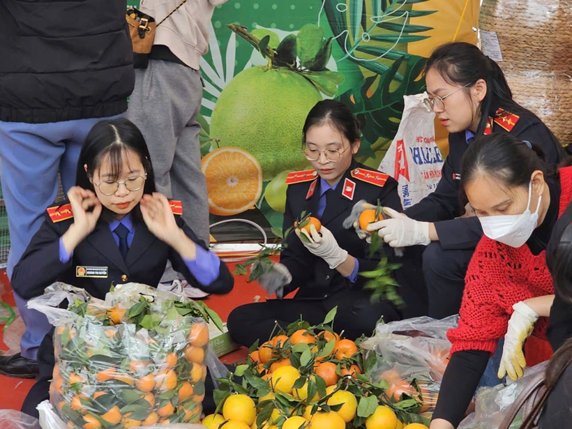 | Đoàn viên nữ VKSND khu vực 5, tỉnh Bắc Ninh tích cực giúp bà con chuẩn bị các gian hàng tại Lễ hội trái cây Bắc Ninh năm 2025. |