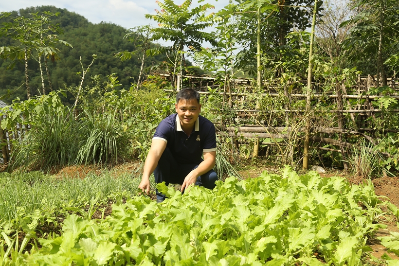 | Ông Hà Đình Điệu, Bí thư Chi bộ, Trưởng bản Chiềng Căm thăm mô hình rau sạch của hộ dân. |