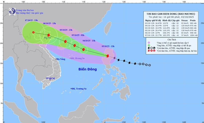 Dự báo của Cơ quan khí tượng thủy văn Việt Nam là khoảng chiều tối 3/10, bão Matmo sẽ vượt qua khu vực phía Bắc của đảo Luzon (Philippines) vào Biển Đông và trở thành cơn bão số 11 trên Biển Đông trong năm 2025. Dự báo, sau khi di chuyển vào Biển Đông, gặp điều kiện nhiệt độ mặt nước biển tương đối thuận lợi (khoảng 29 độ C), độ đứt gió tại khu vực phía Bắc của Biển Đông (nơi vùng tâm bão Matmo di chuyển vào) nhỏ, thuận lợi cho sự phát triển của bão. Trong khi đó, áp cao cận nhiệt đới, hình thế quyết định tốc độ di chuyển vào hướng di chuyển của bão Matmo lấn mạnh về phía Tây khiến bão Matmo có xu hướng mạnh lên và di chuyển nhanh (trung bình từ 25-30 km/h). Cường độ cực đại của bão có thể đạt cấp 12-13, giật cấp 14-15 khi ở phía Đông bán đảo Lôi Châu (Trung Quốc).