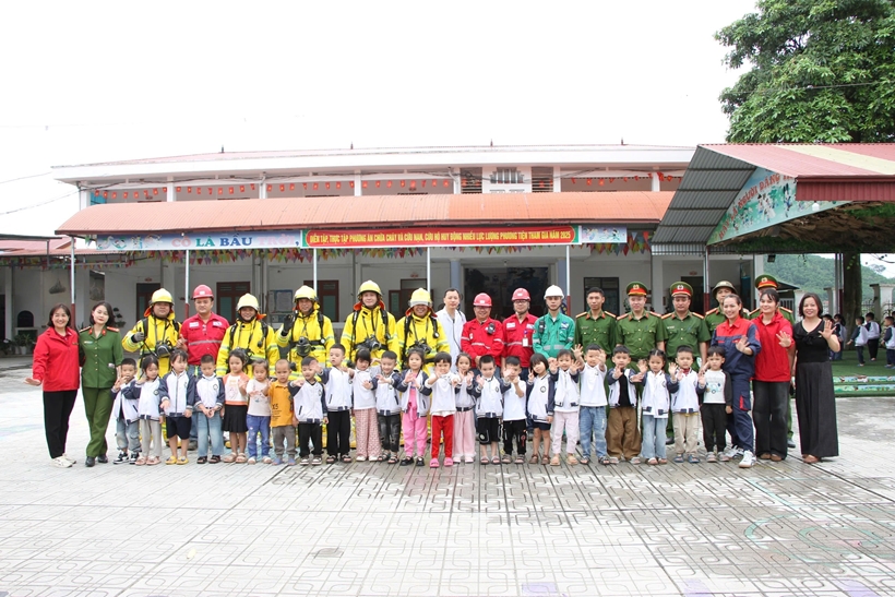 | Đội phòng cháy chữa cháy chụp ảnh kỷ niệm với thầy và trò Trường mầm non xã An Khánh. |