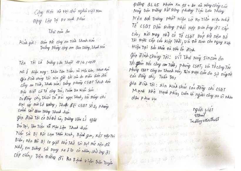 Người thân bệnh nhân cũng cho biết, nhờ được đưa đến Bệnh viện Đa khoa tỉnh Thanh Hóa trong thời gian ngắn nhất, ông Trương Văn Lý đã được các y, bác sĩ tiếp nhận, cấp cứu kịp thời, hiện sức khoẻ tạm thời ổn định. Gia đình bày tỏ sự trân trọng trước tinh thần trách nhiệm, thái độ tận tình của lực lượng làm nhiệm vụ.