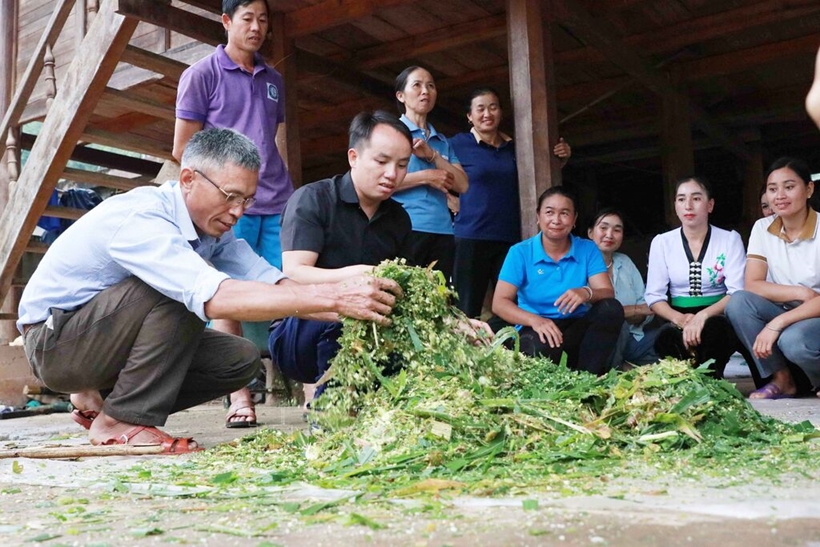 |  Lớp tập huấn hướng dẫn người dân bản Nà Bán, xã Mường Nhé cách trộn thức ăn xanh với liều lượng hợp lý để vật nuôi khỏe mạnh, sinh sản tốt hơn. Ảnh TTXVN |