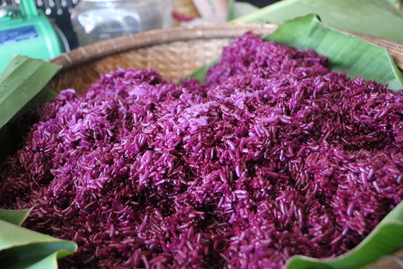 Không kém phần đặc sắc là món xôi tím. Đây là món ăn luôn khiến thực khách dừng ánh nhìn lâu hơn bởi sắc màu bắt mắt, được nhuộm từ một loài cây rừng quen thuộc. Nguyên liệu chính là nếp nương, loại nếp được trỉa trên những triền đồi cao, hạt nhỏ, thơm dẻo, được gửi từ Sơn La vào. Đi cùng là lá cẩm, sau khi hái về được rửa sạch, đun sôi cho đến khi tiết ra thứ nước sánh đặc mang màu tím biếc đặc trưng.
