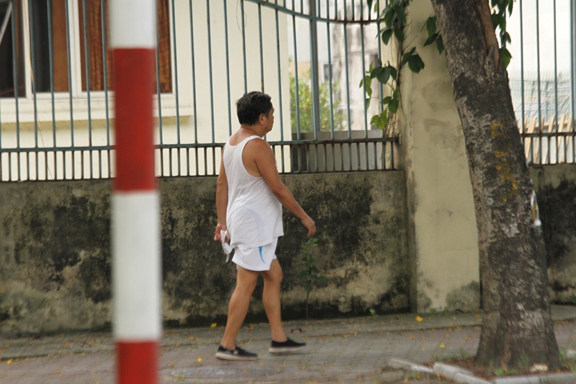 | Một người dân đi bộ tập thể dục trước cổng Bộ Ngoại giao trên đường Lê Quang Đạo. |