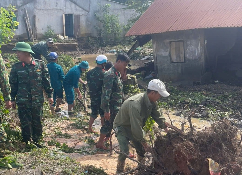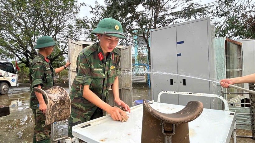 | Các chiến sĩ bộ đội nỗ lực hỗ trợ địa phương dọn dẹp,rửa từng đồ vật. |