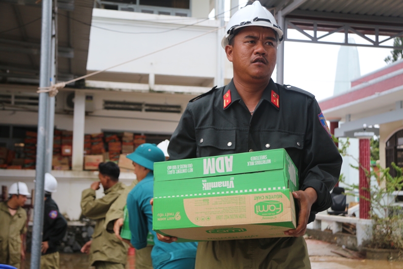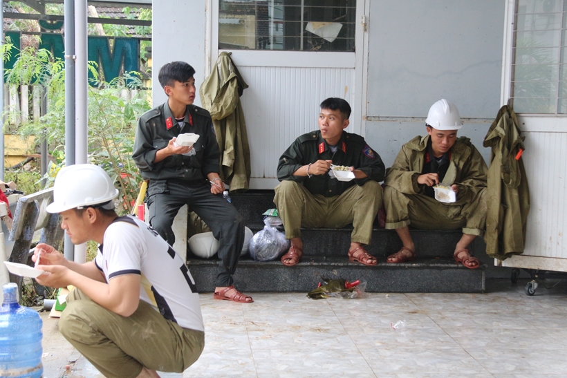 | Để kịp thời đưa hàng cứu trợ đến tay bà con, nhiều cán bộ, chiến sĩ chỉ kịp ăn vội bữa trưa. |