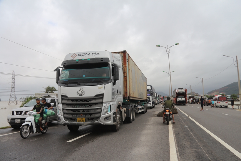 | Trên quốc lộ 1, từng đoàn xe từ thiện nối đuôi nhau tiến vào vùng rốn lũ. |