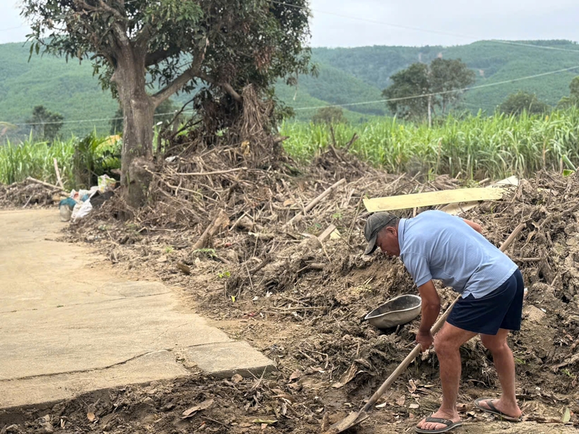 Không chỉ lo dựng lại mái ấm, người dân Bãi Điều cũng đang khẩn trương quay lại với ruộng đồng. Anh Huỳnh Nhơn Ân (SN 1972) cho biết, gia đình anh có 3ha mía và 4 sào lúa, nhưng trận lũ cuối tháng 11/2025 đã cuốn trôi 1,5ha mía. Những ngày này, anh miệt mài dọn rác, đốt gốc cây, thuê máy cày bừa để kịp khôi phục sản xuất cho vụ Đông Xuân.