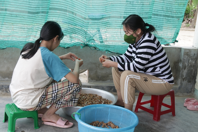 | Nhiều hộ bóc đậu phộng (lạc) giống để chuẩn bị sản xuất trở lại. |