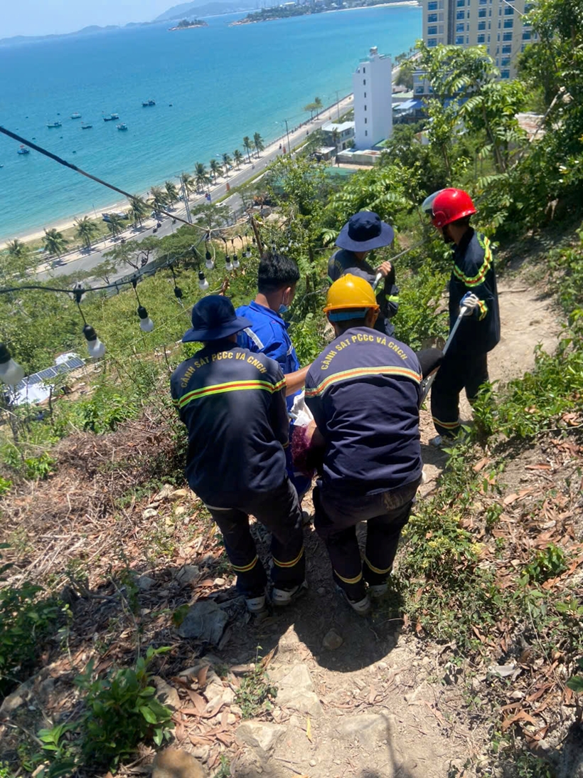 Chỉ hơn nửa giờ sau, đến 12h05’, Đội CNCH khu vực 9 cùng lực lượng cấp cứu 115 đã tiếp cận được nạn nhân, cách chân núi 500m, tiến hành sơ cứu ban đầu và di chuyển nạn nhân xuống núi bằng cáng an toàn để chuyển đến Bệnh viện đa khoa Khánh Hòa cấp cứu.
