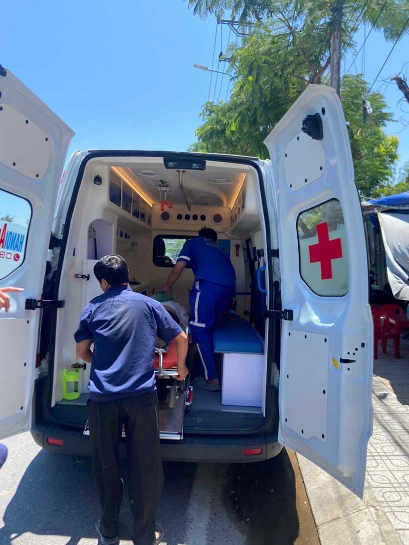 | Nạn nhân được đưa lên xe cứu thương để chuyển đến bệnh viện cấp cứu. Ảnh: CA. |