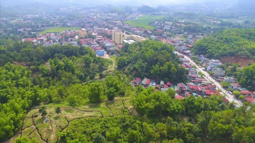 | Toàn cảnh bản vùng cao Điện Biên với những ngôi nhà mới xen lẫn núi rừng. |