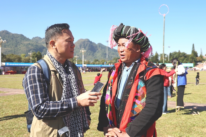 | Thầy cúng Lù A Páo chia sẻ với PV Báo Bảo vệ pháp luật bên lề sân khấu tái hiện. |