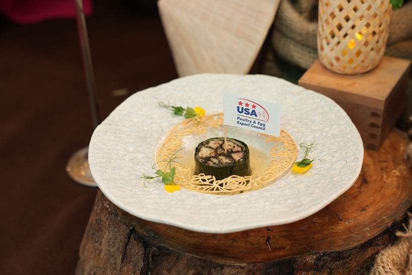 | Món U.S. Chicken wrapped in ST25 rice (Gà Mỹ cuộn cơm ST25) được trình bày ấn tượng, thể hiện tay nghề tinh tế, kỹ thuật chế biến hiện đại, đồng thời tôn vinh bản sắc ẩm thực Việt Nam qua từng món ăn. |