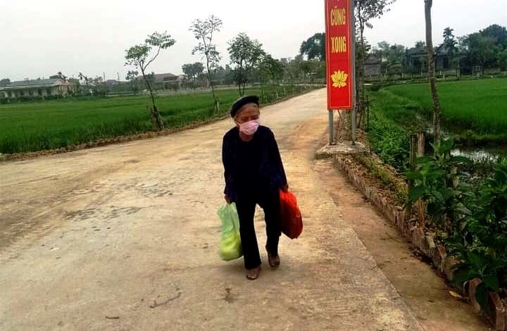 | Mẹ Liệt sĩ Nguyễn Thị Ba đi bộ mang gạo, rau đến ủng hộ. |