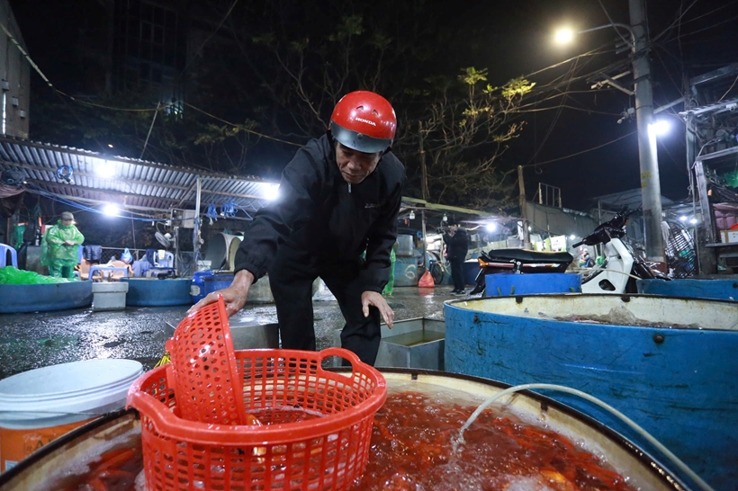 | Tại chợ cá Yên Sở, loại cá chép được bán chủ yếu là cá chép đỏ và cá chép vàng. |