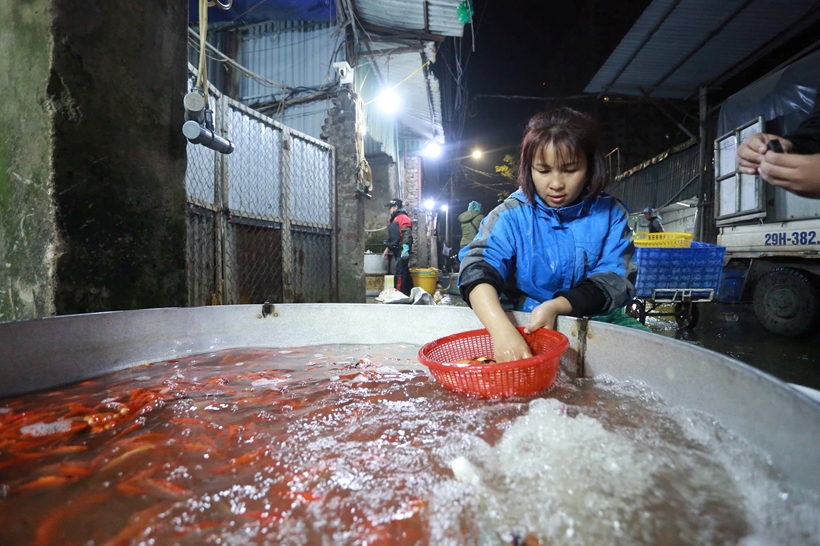 | Chợ cá Yên Sở nhộn nhịp các tiểu thương chở cá chép về bán phục vụ người dân cúng Tết ông Công, ông Táo. |