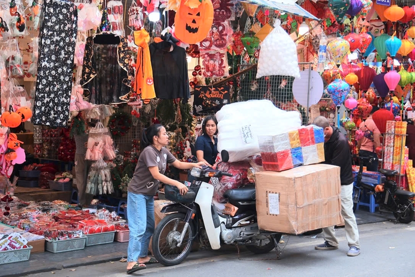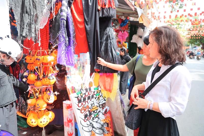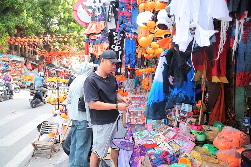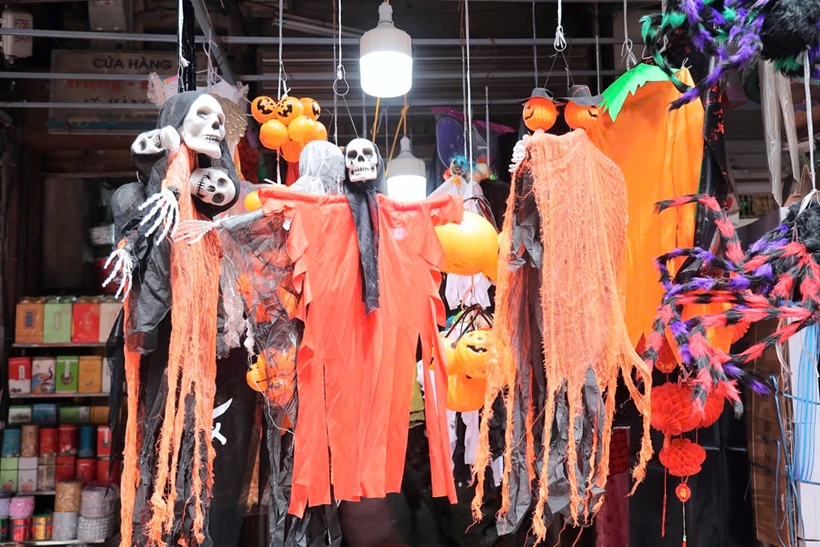 | Trên phố Hàng Mã những ngày cận Halloween, các cửa hàng rộn ràng bày bán hàng loạt sản phẩm trang trí quen thuộc như quả bí ngô, mô hình phù thủy, mặt nạ ma quái, lồng đèn và mạng nhện. |