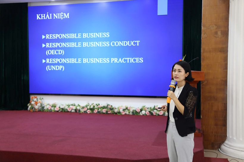 Tại hội nghị, các đại biểu được nghe báo cáo “Tổng quan về Chương trình hành động quốc gia hoàn thiện chính sách và pháp luật nhằm thúc đẩy thực hành kinh doanh có trách nhiệm tại Việt Nam giai đoạn 2023 – 2027” do TS. Lưu Hương Ly, đại diện Vụ Pháp luật Dân sự, kinh tế – Bộ Tư pháp, trình bày. TS. Lưu Hương Ly cho biết, chương trình hành động quốc gia được Thủ tướng Chính phủ phê duyệt nhằm cụ thể hóa mục tiêu phát triển bền vững, tăng cường trách nhiệm của doanh nghiệp đối với con người, xã hội và môi trường, đồng thời bảo đảm tuân thủ các cam kết quốc tế của Việt Nam trong các hiệp định thương mại tự do thế hệ mới.