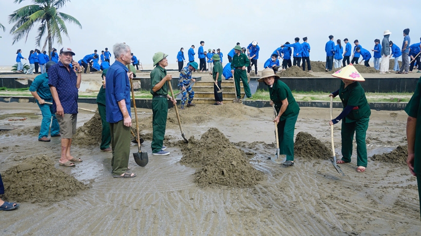Lực lượng chức năng, các đoàn thể và bà con Nhân dân tổng lực hoàn trả cát lại bãi biển. |