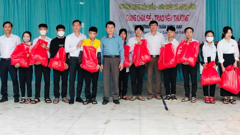 | Ban Giám hiệu nhà trường tặng quà cho học sinh có hoàn cảnh khó khăn để "cùng chia sẻ, trao yêu thương" |