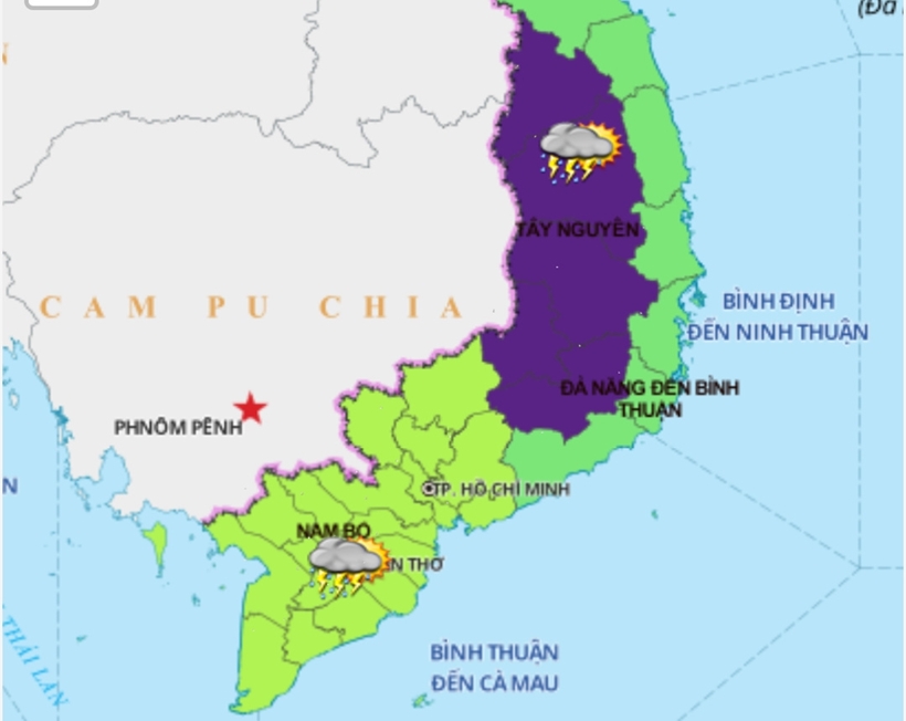 Khu vực Tây Nguyên & Nam Bộ: Chiều và tối ngày 15/5 có mưa rào và dông rải rác, cục bộ có nơi mưa to với lượng mưa từ 10-30mm, có nơi trên 50mm.
