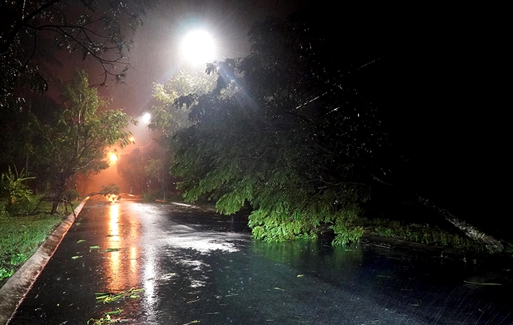 | Sức gió khi áp sát đất liền giật cấp 8 - 9 của bão số 13 đã khiến nhiều cây cối tại tổ dân phố Châu Me và tổ dân phố Long Thạnh 1, phường Sa Huỳnh (Quảng Ngãi) bật gốc, ngã đổ ra đường gây ách tắc giao thông cục bộ. |