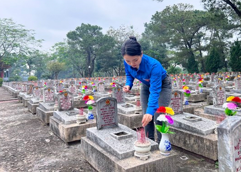 | Các đoàn viên kính cẩn dâng hoa, thắp hương tại Nghĩa trang Liệt sĩ Quốc gia Trường Sơn. |