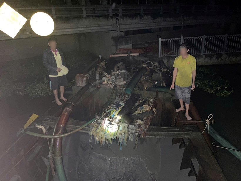 Hai người trên phương tiện là L.V.M.H (SN 1972, trú ấp Thiện Lương, xã Vĩnh Thành) và N.V.S (SN 1977, trú ấp An Khánh, xã Đồng Khởi) thừa nhận hành vi khai thác cát trái phép. Khối lượng cát đang khai thác đo được bên trong ghe gỗ là 7,448m3 cát.
