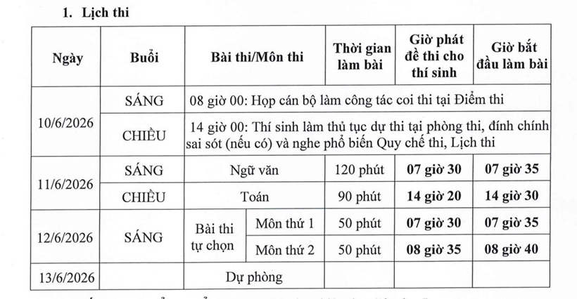 Ngày 11/6/2026, buổi sáng tổ chức thi môn Ngữ văn, thời gian làm bài 120 phút; buổi chiều thi môn Toán, thời gian làm bài 90 phút.
