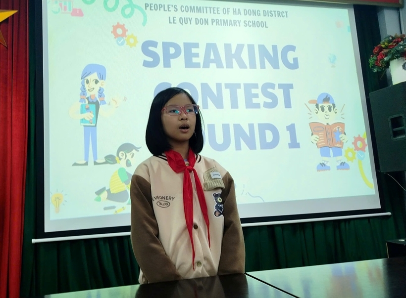 | Trường Tiểu học Lê Quý Đôn (phường Dương Nội, Hà Nội) tổ chức cuộc thi hùng biện tiếng Anh cho học sinh các khối. |