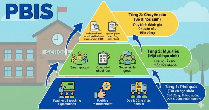 Tầng 2 – Dành cho nhóm có nguy cơ, phân công “người đỡ đầu” (check-in/check-out) theo dõi mục tiêu hành vi; thiết lập “góc tĩnh tâm” để tự điều hòa cảm xúc; triển khai “hợp đồng hành vi” giữa giáo viên – học sinh – phụ huynh, tập trung hỗ trợ thay vì trách phạt.