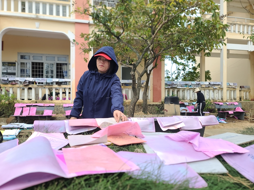 | Các giáo viên tranh thủ phơi giấy tờ, hồ sơ sau nhiều ngày ngâm nước lũ. |
