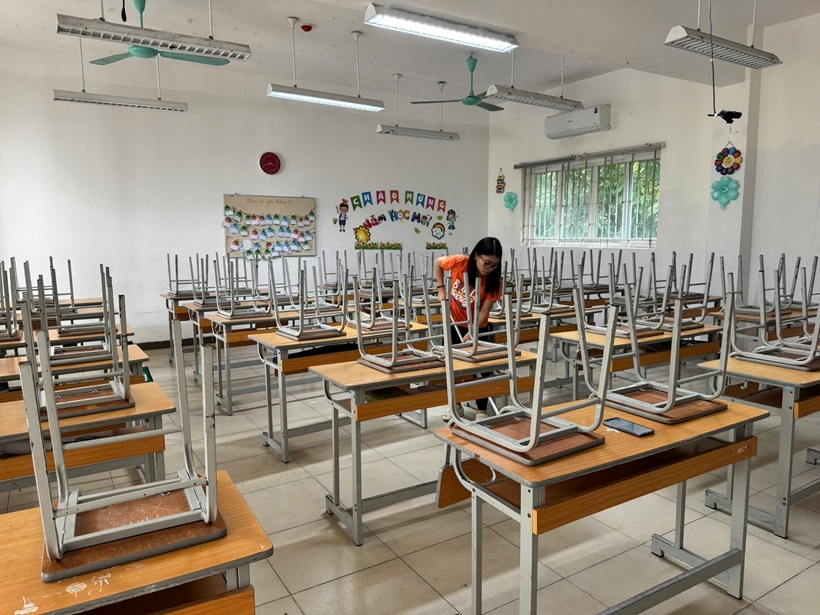 Ngày 1/10, Trường THCS Ngọc Thụy (Hà Nội) dọn dẹp, vệ sinh để ngày mai đón học sinh trở lại trường. |
