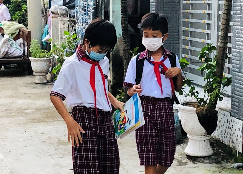 Theo chị Lê Thị Thanh Xuân (xã Thạnh An), gia đình có hai đứa con, đứa lớn học lớp 6, đứa nhỏ năm nay vào lớp 1. Sau hai lần đi học "hụt" vì nhà trường tạm hoãn để chuẩn bị công tác phòng, chống dịch COVID-19 được tốt hơn thì hôm nay các con của chị được đến trường.