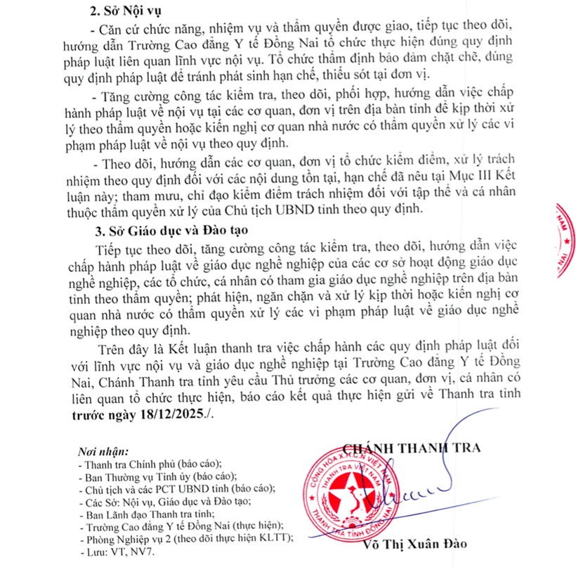 | Kết luận Thanh tra đề nghị Sở Nội vụ và Sở Giáo dục và Đào tạo căn cứ chức năng, nhiệm vụ và thẩm quyền được giao, tiếp tục theo dõi, hướng dẫn Trường Cao đẳng Y tế Đồng Nai tổ chức thực hiện đúng quy định pháp luật. |