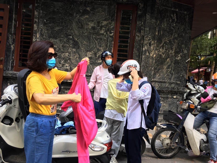 | Một phụ huynh đón con làm thủ tục xong, mặc áo chống nắng. |