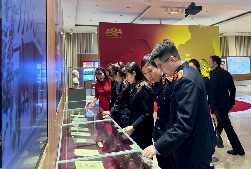 | Đoàn tham quan, tìm hiểu tại Phòng truyền thống tại Tòa nhà Quốc hội. |