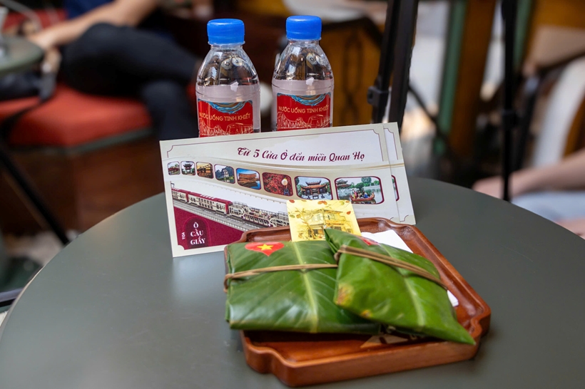 Một điểm khác biệt khiến chúng tôi thích thú ngay từ khi đặt chân lên con tàu tàu hai tầng, có xép chính là không gian sắp đặt bàn ghế, trang trí, bày biện độc đáo ở từng cửa ô khác nhau, như kể một câu chuyện riêng. Trên bàn, các nhân viên đã bày những thức quà Hà Nội chuẩn bị cho du khách thưởng thức.