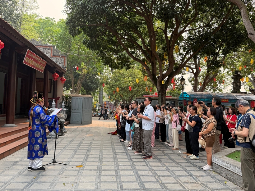 Ông Nguyễn Tiến Chiến, Trưởng Ban quản lý Đền Đô thông tin: “Từ tháng 8/2025, đoàn tàu “Hà Nội 5 cửa ô” bắt đầu hợp tác với các đơn vị chức năng, đưa khách về đền. Số lượng khách ở Đền Đô cũng có tăng hơn trước và nhiều khách là người nước ngoài. Có những thời điểm khách tăng đột biến, như hôm nay, đền vinh dự đón hơn 800 học sinh cùng với các du khách trên tàu. Chính vì vậy, chúng tôi đã phân công các nhiệm vụ cho từng thành viên, đảm bảo từ khâu đón tiếp, tổ chức nghi lễ dâng hương đến thuyết minh về di tích lịch sử, tổ chức văn nghệ, hát quan họ và giao lưu cùng du khách đều được diễn ra thuận lợi, mang đậm nét lịch sử gắn với tâm linh và văn hoá miền qua họ…”.