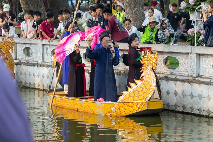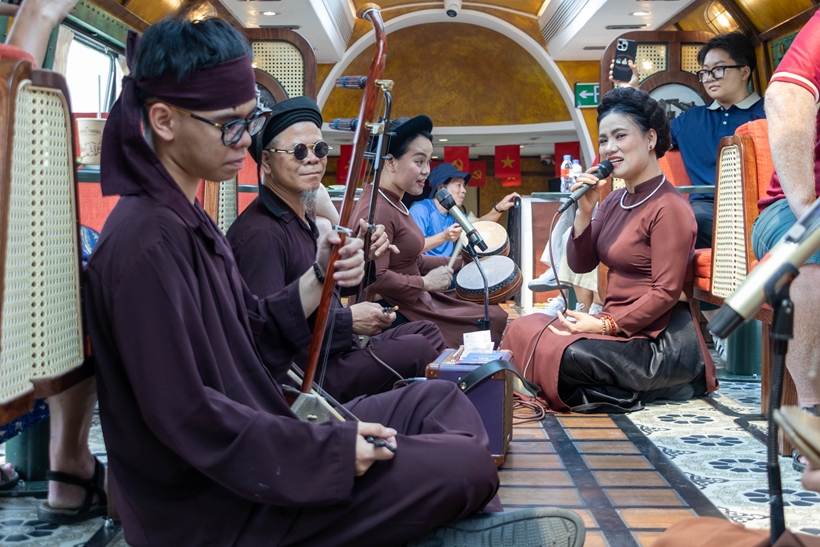 | Các nghệ nhân biểu diễn và giao lưu cùng du khách trên tàu. |