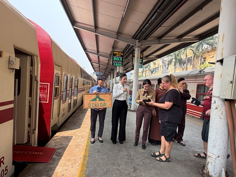 | Nhân viên hướng dẫn du khách nước ngoài trải nghiệm hành trình Đoàn tàu "Hà Nội 5 cửa ô". |
