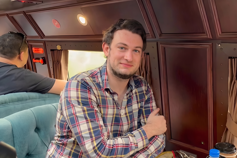 | Anh Matt Rolley thể hiện sự thích thú và ấn tượng khi trải nghiệm chuyến tàu “Hà Nội 5 cửa ô”. |
