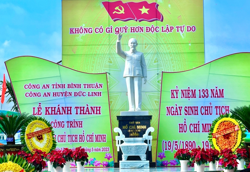 | Toàn cảnh tượng đài Chủ tịch Hồ Chí Minh đặt trang trọng tại khuôn viên Công an huyện Đức Linh. |