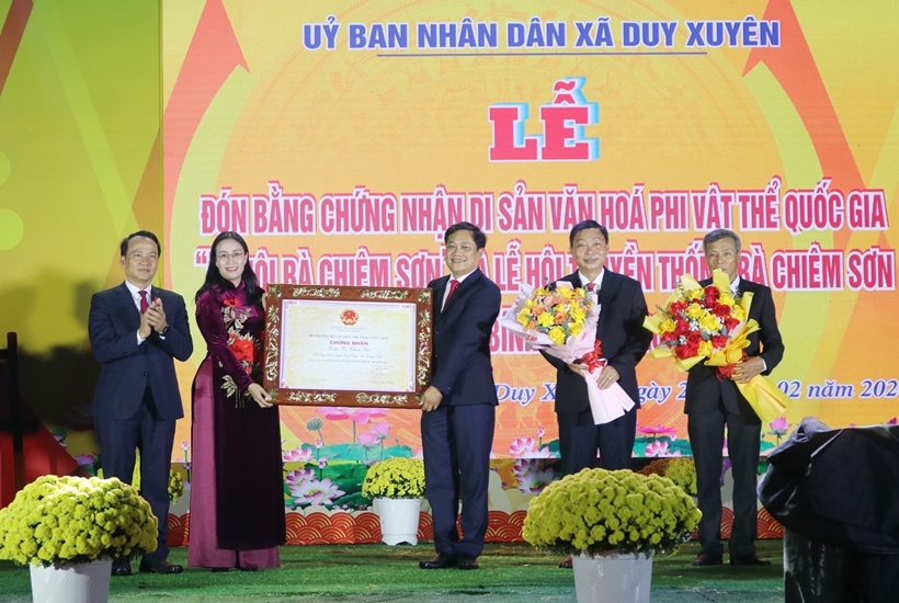 | Lãnh đạo TP Đà Nẵng trao Bằng chứng nhận Di sản văn hóa phi vật thể cấp quốc gia Lễ hội Bà Chiêm Sơn cho xã Duy Xuyên. |
