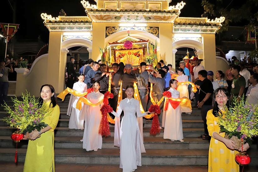 | Người dân tham gia rước kiệu Bà tại Lễ hội Vía Bà Chúa Xứ núi Sam. |